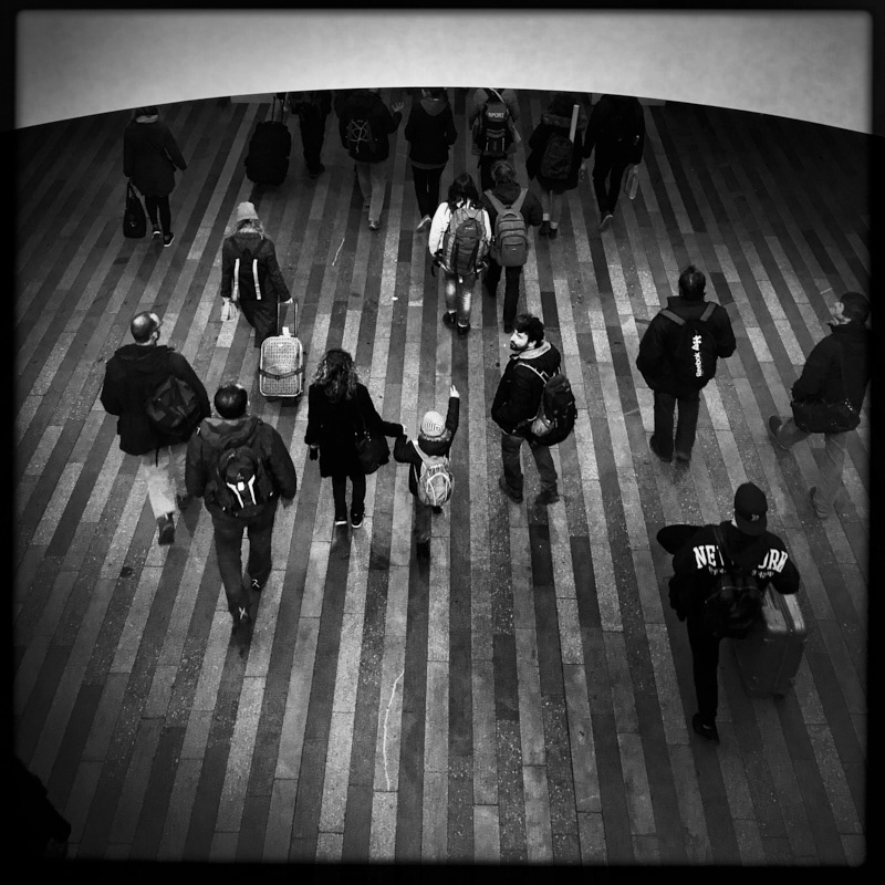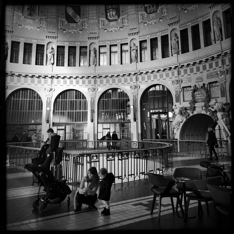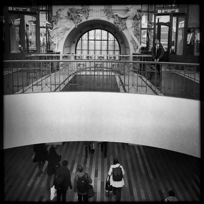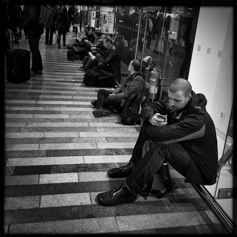 Due to rail failure, trains have about two and a half hours delay. The only happy one is the cleaning staff. There are only a handful of passengers on the platform and an old locomotive decorated by sprayers. Empty escalators. The historical building of the train station is a good place to take selfies. There is no place to sit. The reporter gives the TV viewers a fresh report on train delays. The audacity of the piano echoes the hall. As the trains started to move passengers left stores. A quick phone call and then a straight to the platform. The delayed train finally arrives.